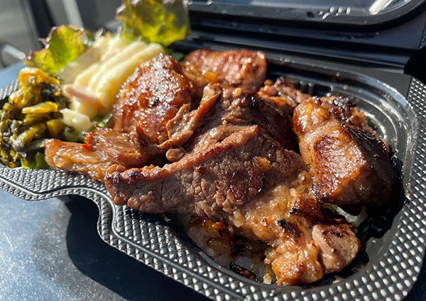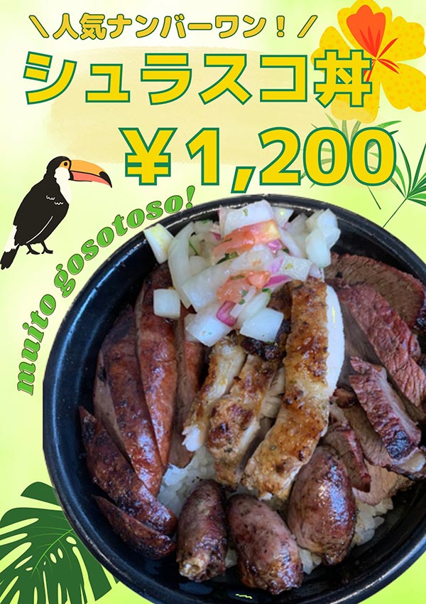 『シュラスコ丼』 当日販売価格(税込):1,200円 ガーリックライスの上に炭火で焼いた牛肉、リングイッサソーセージ、味付けチキンをのせた丼ぶりです。玉ねぎ、トマト、きゅうり、パセリを刻んでお酢などで味付けしたらヴィナグレッチソースもつきます! |