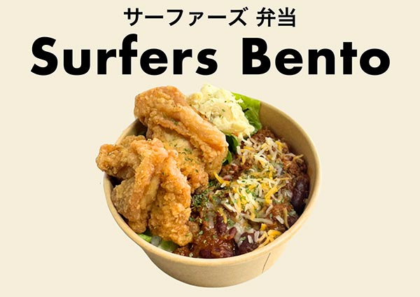 『Surfers Bento』 当日販売価格(税込):1,100円 当店自慢のチリビーンズにフライドチキンとマカロニポテトを詰め合わせたお弁当です。 サーファーが海から上がった後に食べたくなるような湘南を感じる1品です。 |
