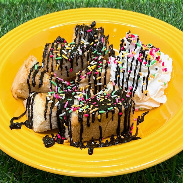 『カラフルショコラ』 当日販売価格(税込): 660円 外はこんがり、中はふんわり。香ばしい生地にとろ〜りチョコソースをたっぷりかけ、カラフルスプレーで仕上げた、見た目も楽しい甘党必見のフレンチトースト。 |