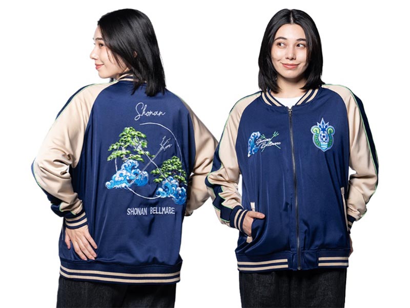 湘南ベルマーレのエンブレムの象徴である鉾と、湘南らしさあふれる波、海岸沿いに並ぶ松の木を本格的な刺繍でデザインしたスカジャンが登場!