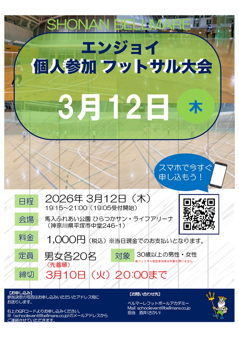 【参加者募集】3月12日(木)「エンジョイ個人参加 フットサル大会」@ひらつかサン・ラ イフアリーナ