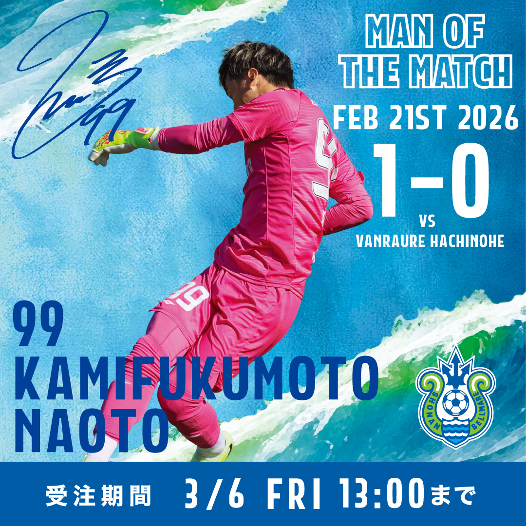 2月21日(土)八戸戦で「相模石油MAN OF THE MATCH」に選出された上福元直人選手のグッズを、湘南ベルマーレ公式オンラインストアで受注販売いたします。