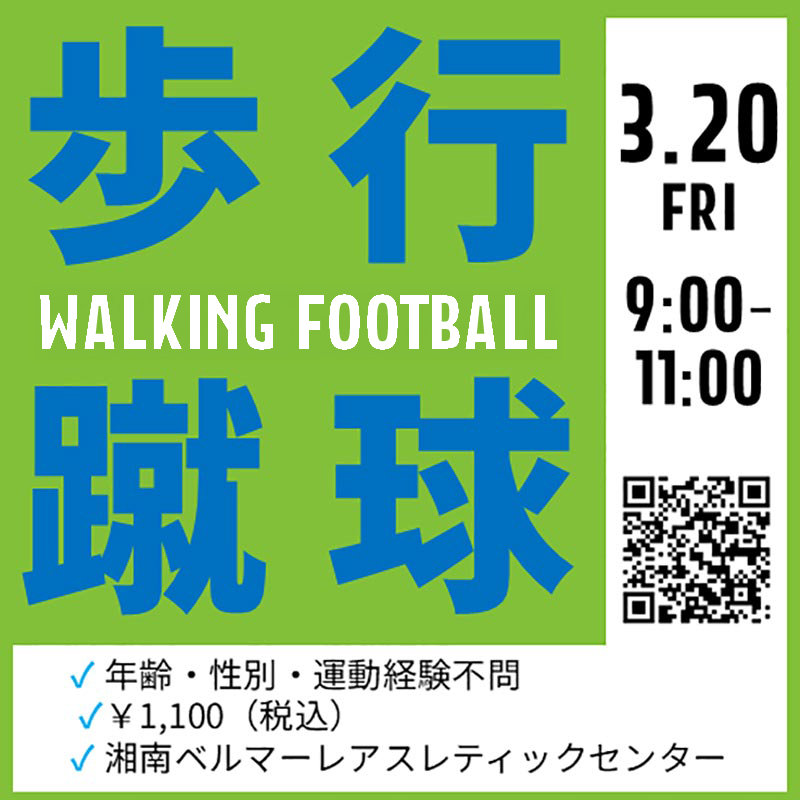 3月20日(金祝)に湘南ベルマーレアスレティックセンターフットサルコートで、全年齢対象「ウォーキングフットボール」を開催いたします。