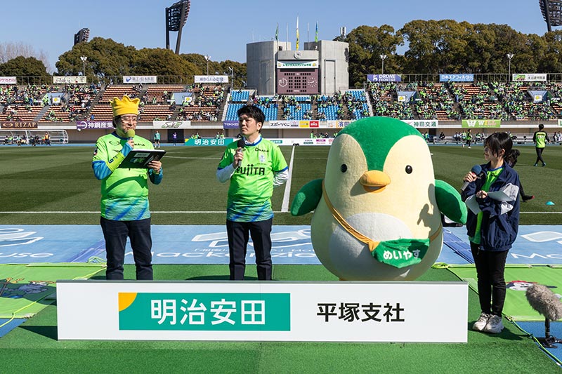 ゲストトークには、明治安田 平塚支社支社長 大井 浩嗣様とマスコットキャラクター「めいやすペンタン」にご登場いただき、熱いエールを送っていただきました。