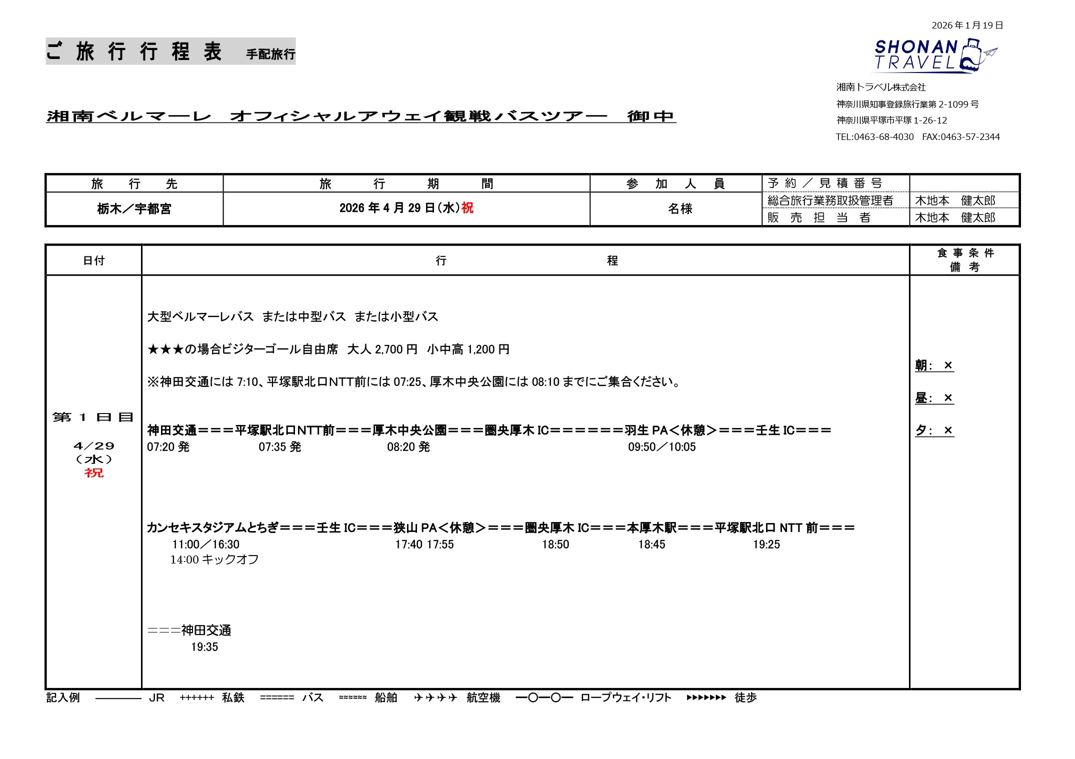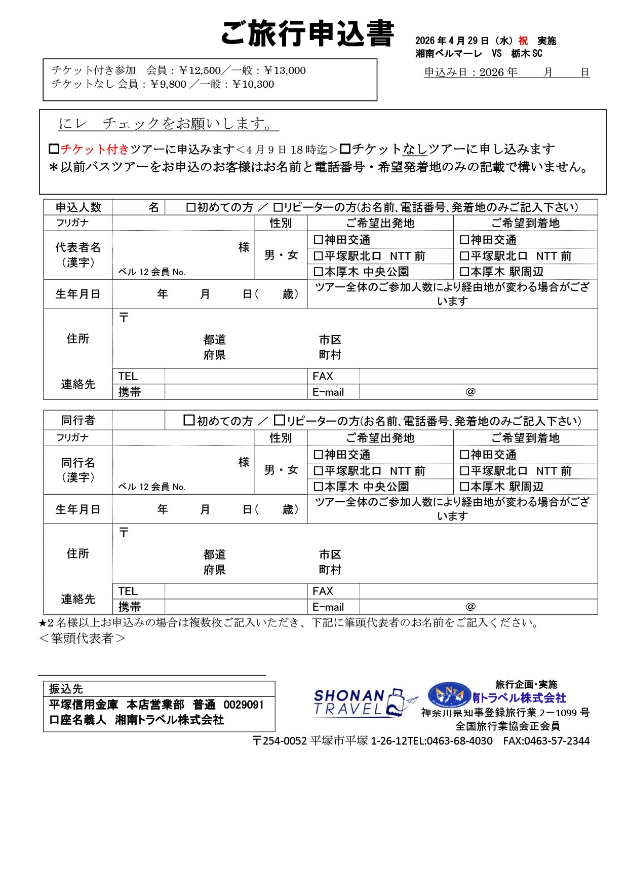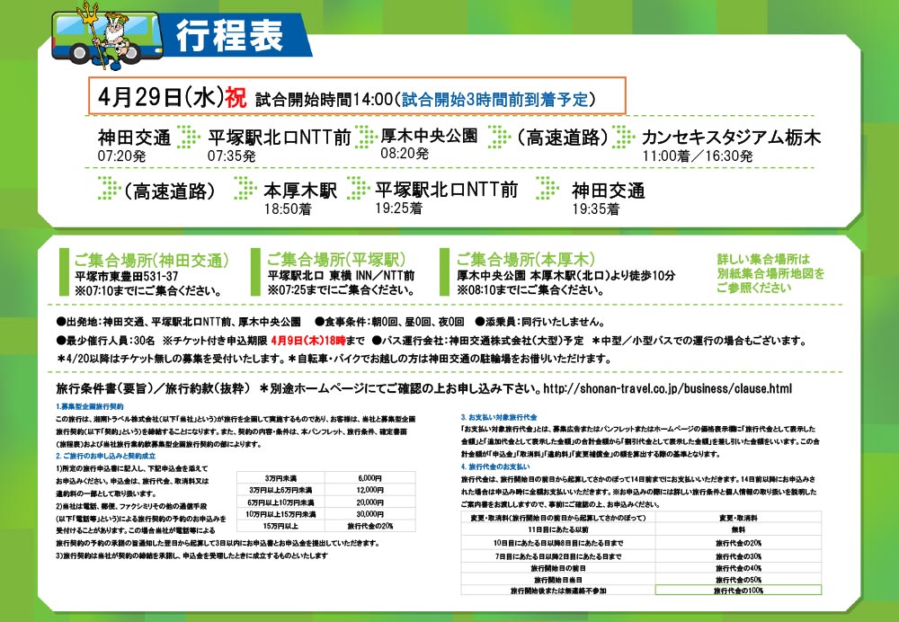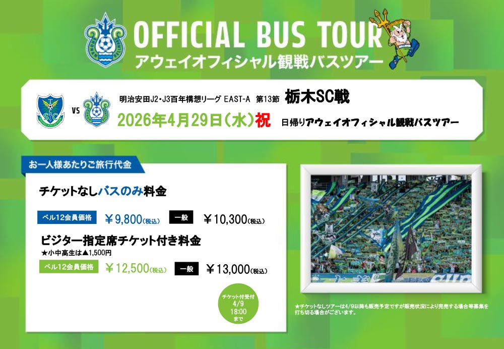 4月29日(水祝)14:00からカンセキスタジアムとちぎで行われる明治安田J2・J3百年構想リーグ EAST-A第13節 栃木SC戦のビジター席チケット付き、神田交通車庫・平塚駅北口 NTT前・本厚木 厚木中央公園裏よりご乗車いただけるバスツアーを実施いたします! 応援に駆けつけてくださるサポーターの皆さまの熱気・拍手・手拍子が選手たちの大きなパワーとなります。