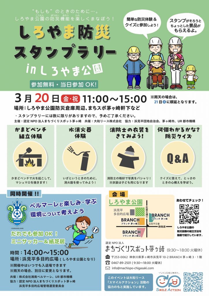 また同日に、『もしものときのために、しろやま公園の防災機能を楽しくまなぼう!』をテーマに、しろやま公園で防災イベントを開催しています。