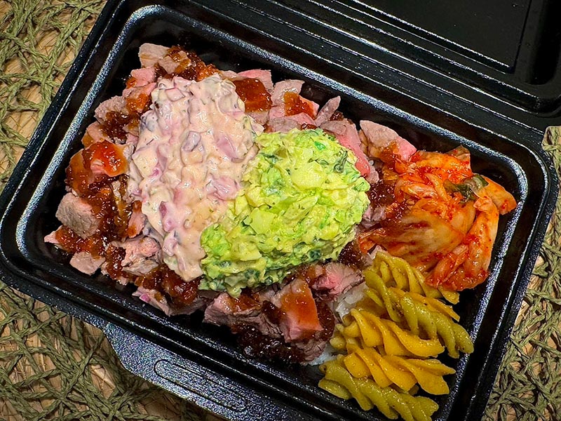 モチコチキン、ガーリックシュリンプ、ロコモコ、ステーキをお好きな組み合わせでランチBOXとしてお楽しみください。