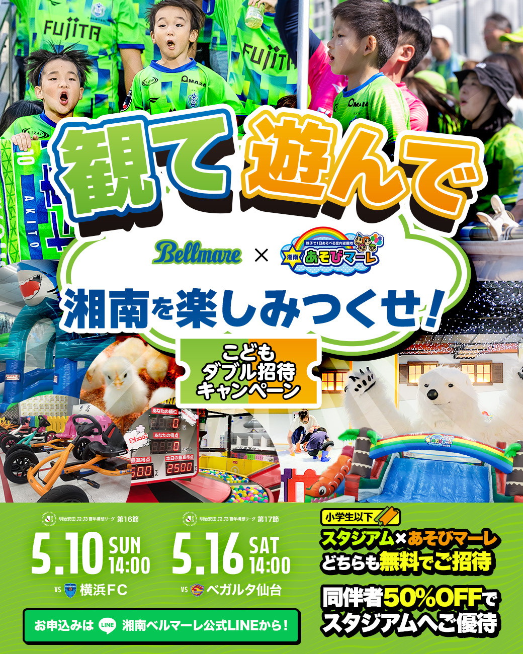 5月ホームゲーム「いいじゃん湘南」の特別企画として、「湘南ベルマーレ」のホームゲーム観戦と、大人気の室内遊園地「湘南あそびマーレ」の入場券(小学生以下)がセットになったダブル招待キャンペーンを、小学生を対象に実施いたします!