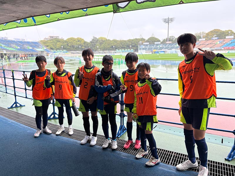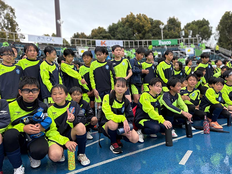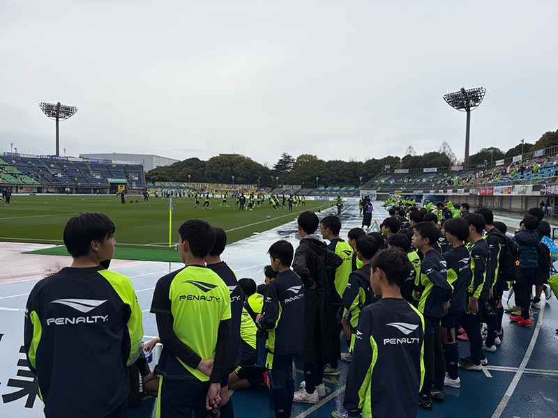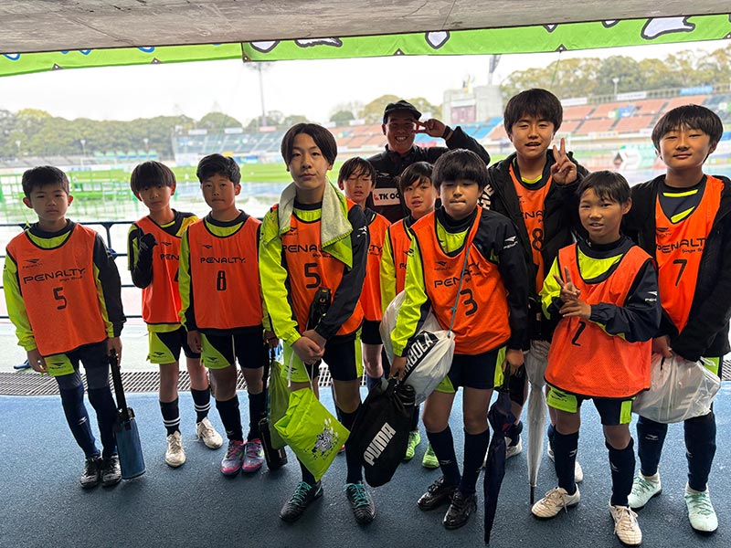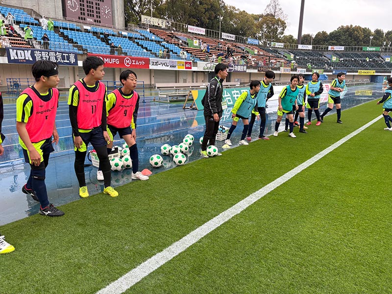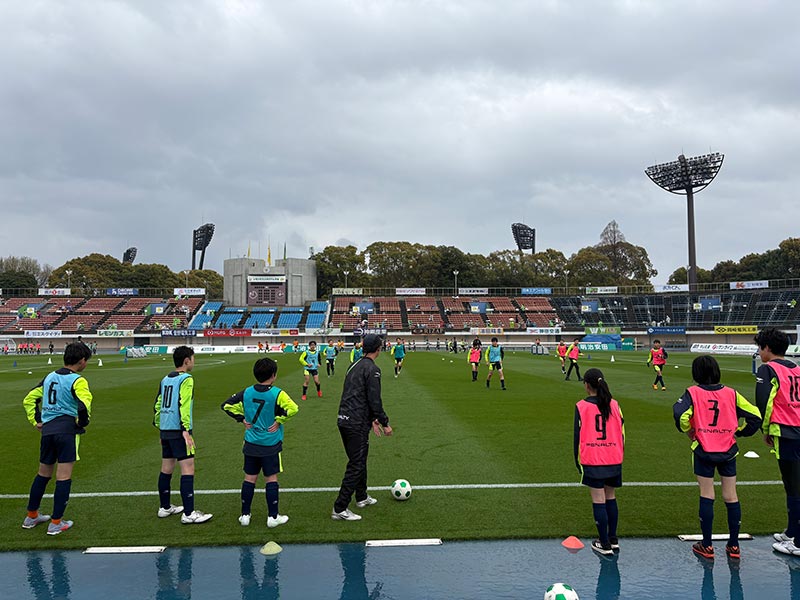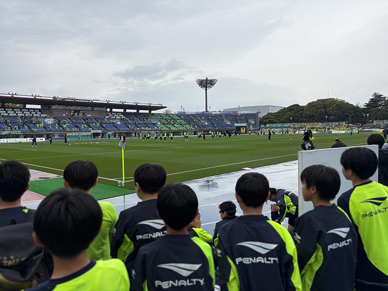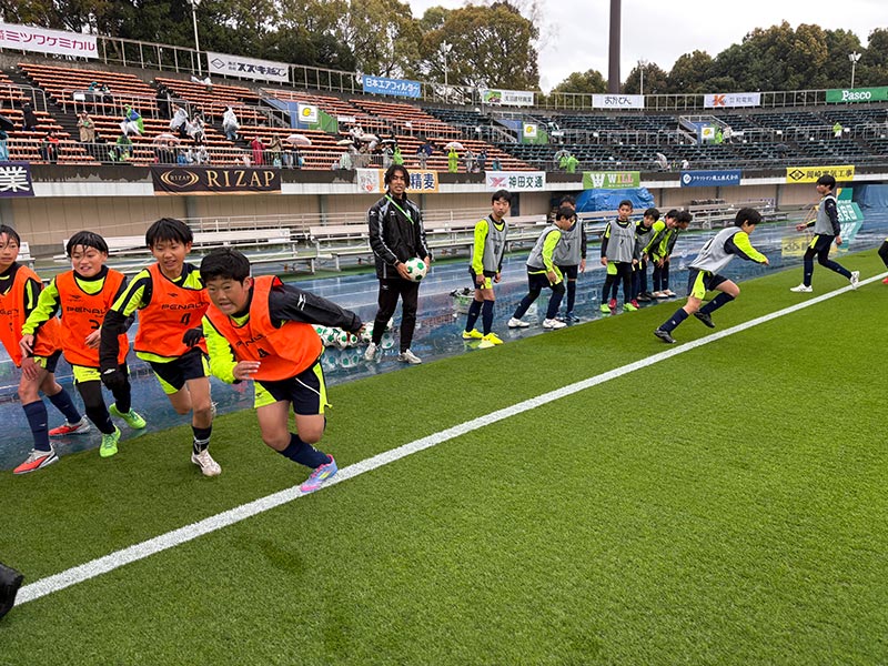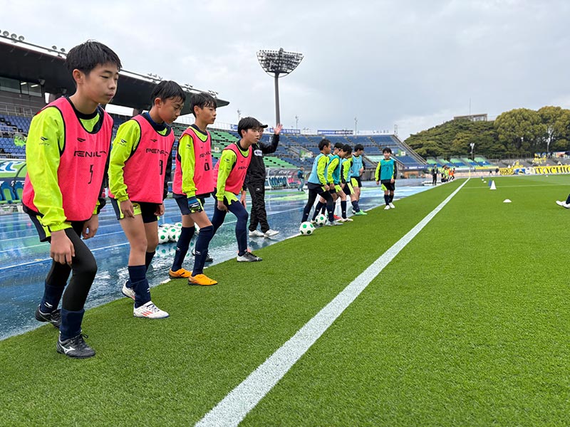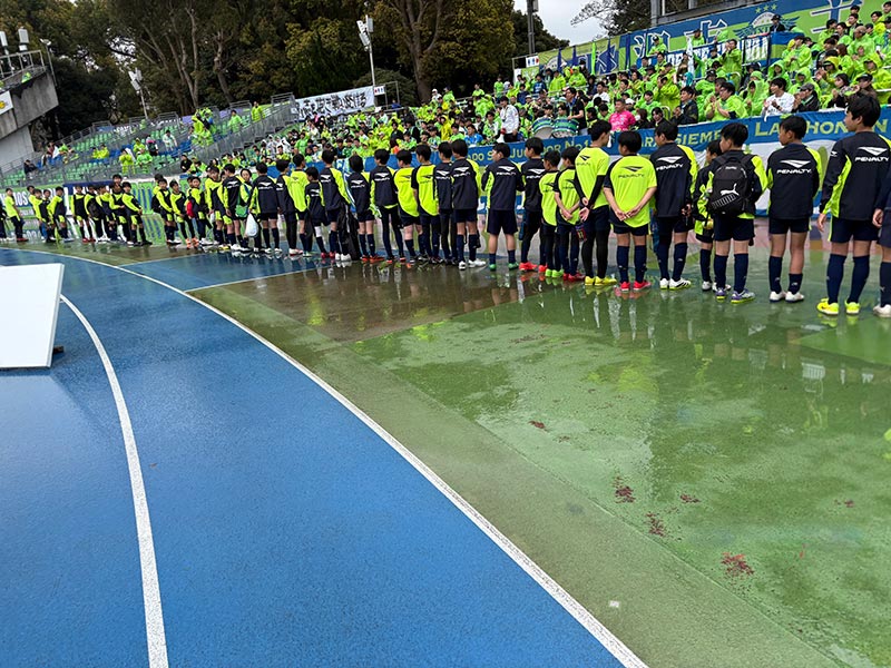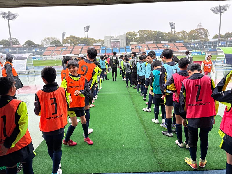 当日はあいにくの雨模様となりましたが、スクール生たちは元気にスタジアムへ集合。