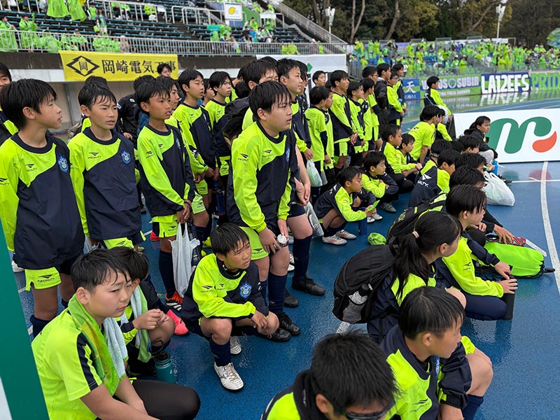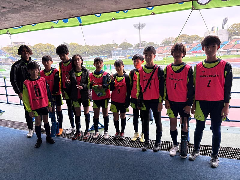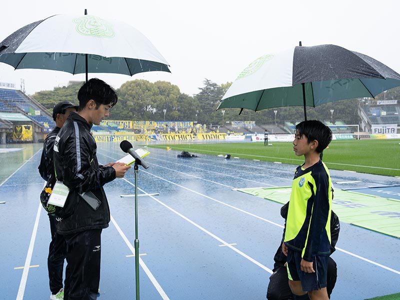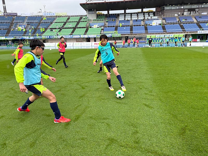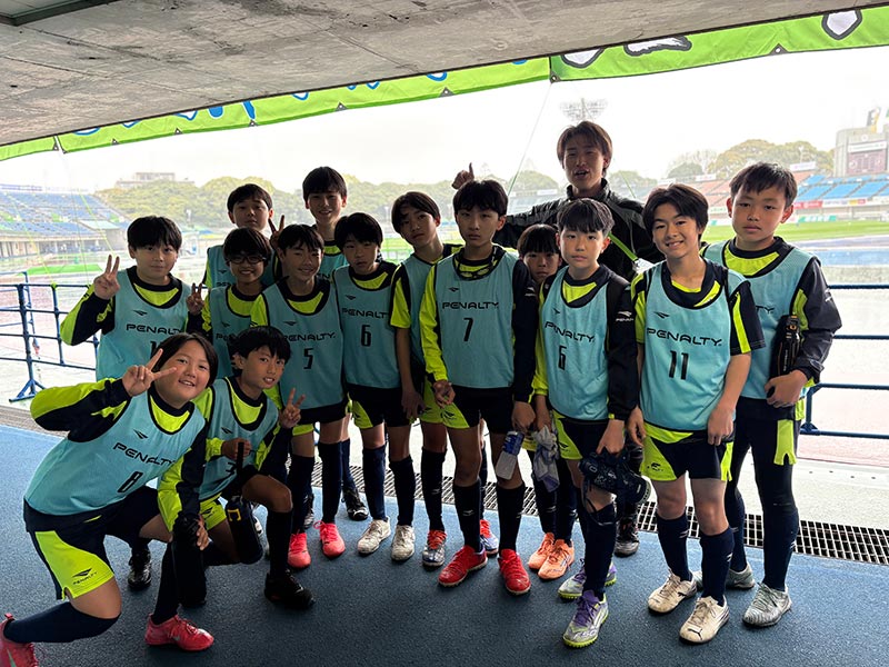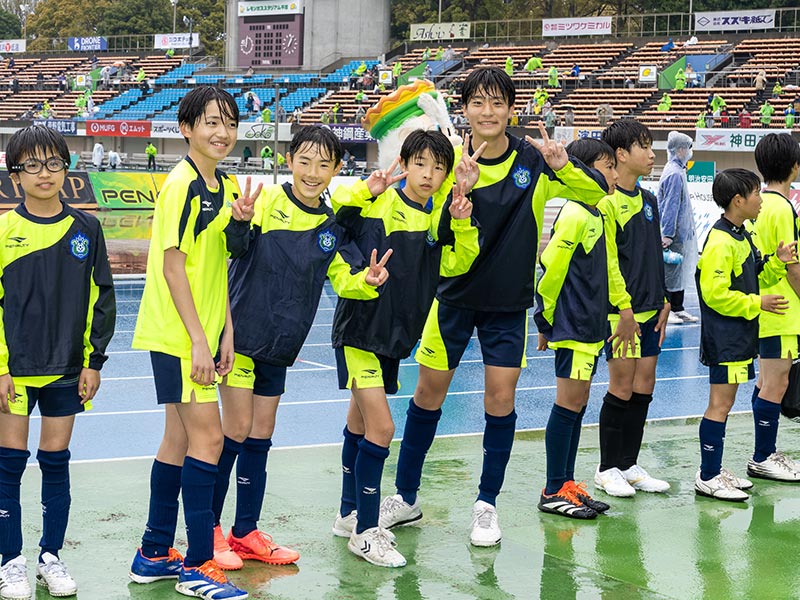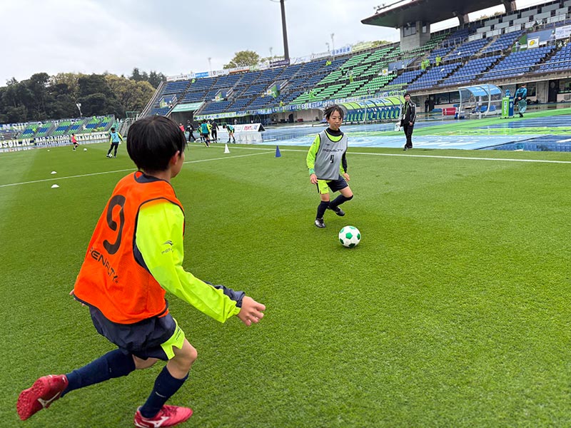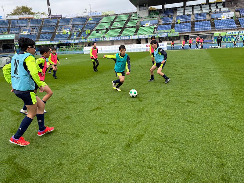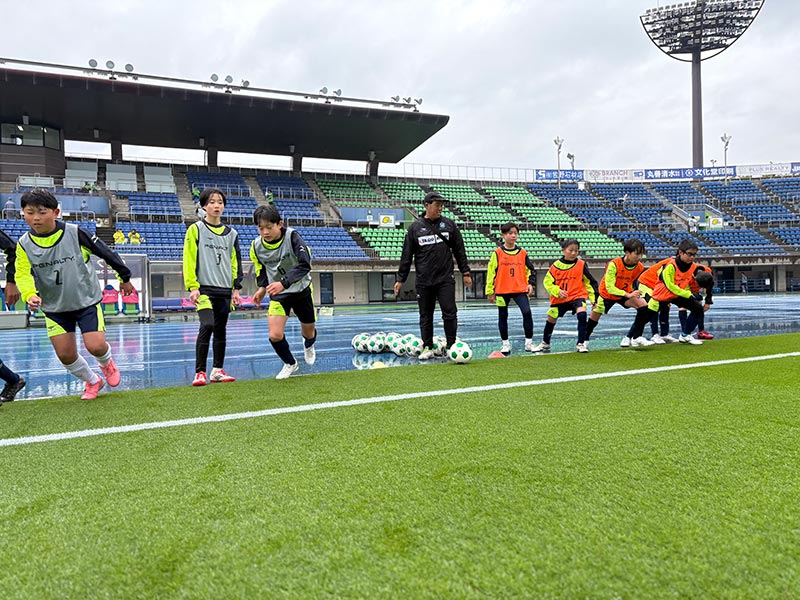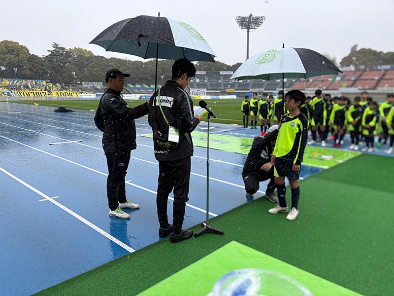 当日はあいにくの雨模様となりましたが、スクール生たちは元気にスタジアムへ集合。