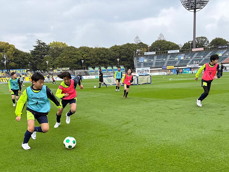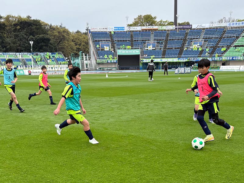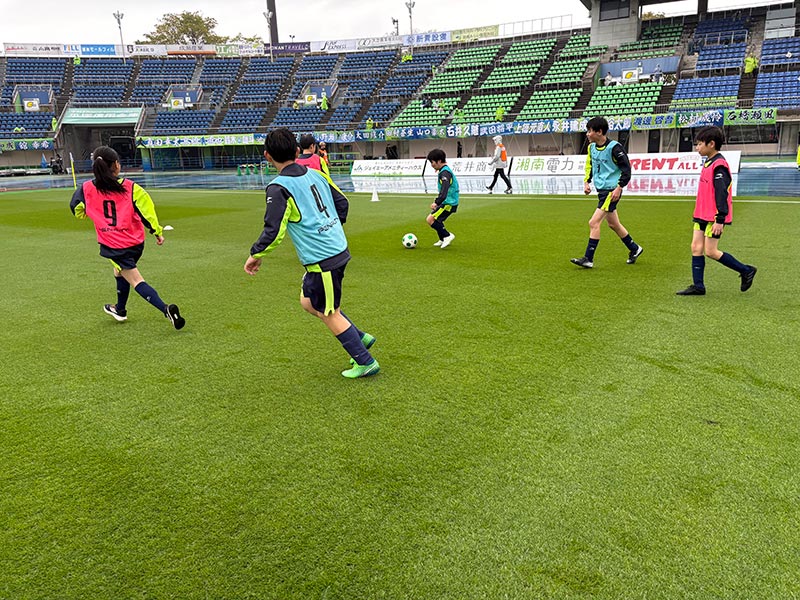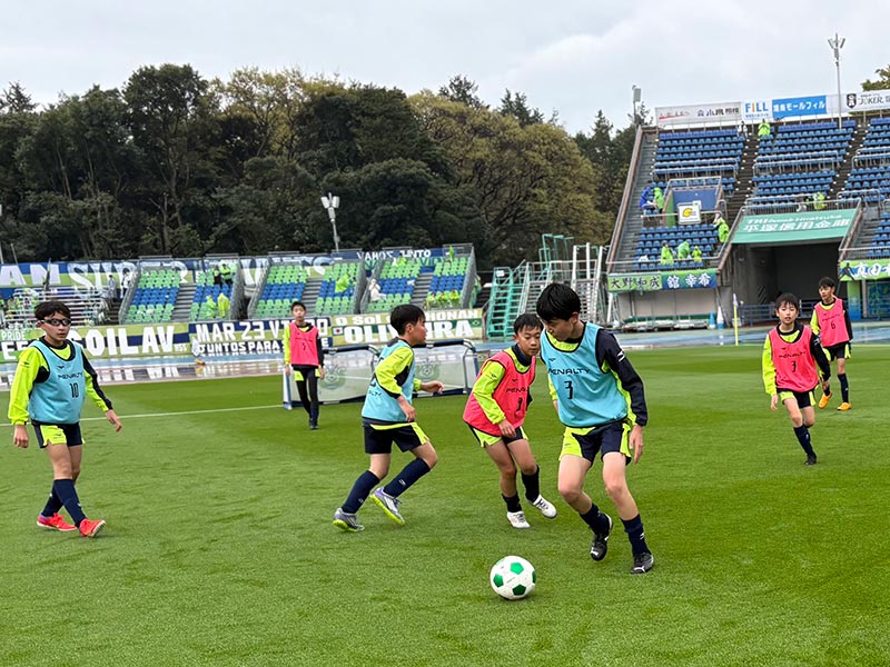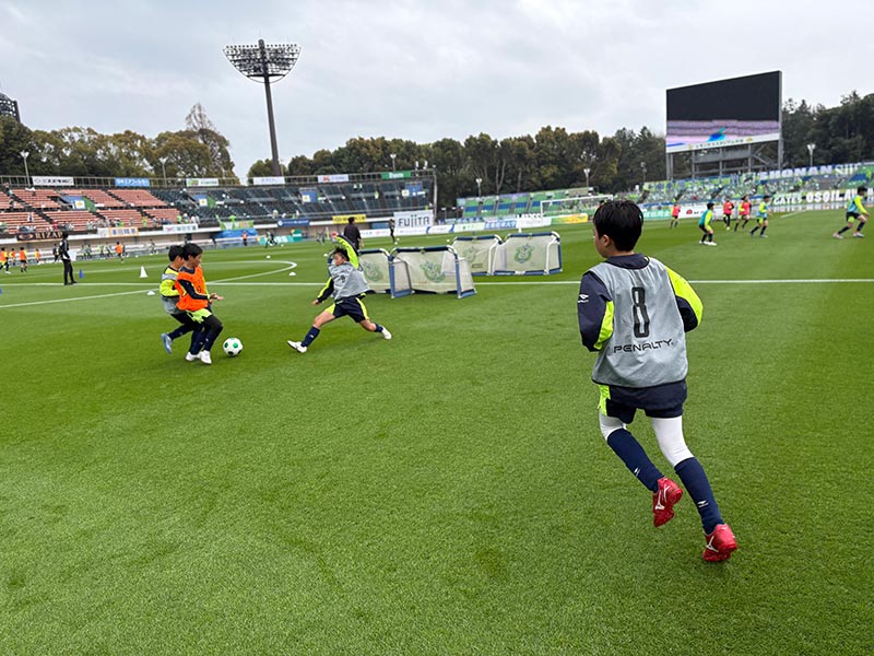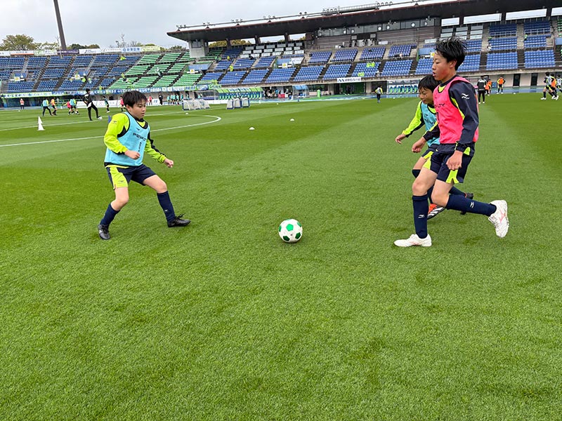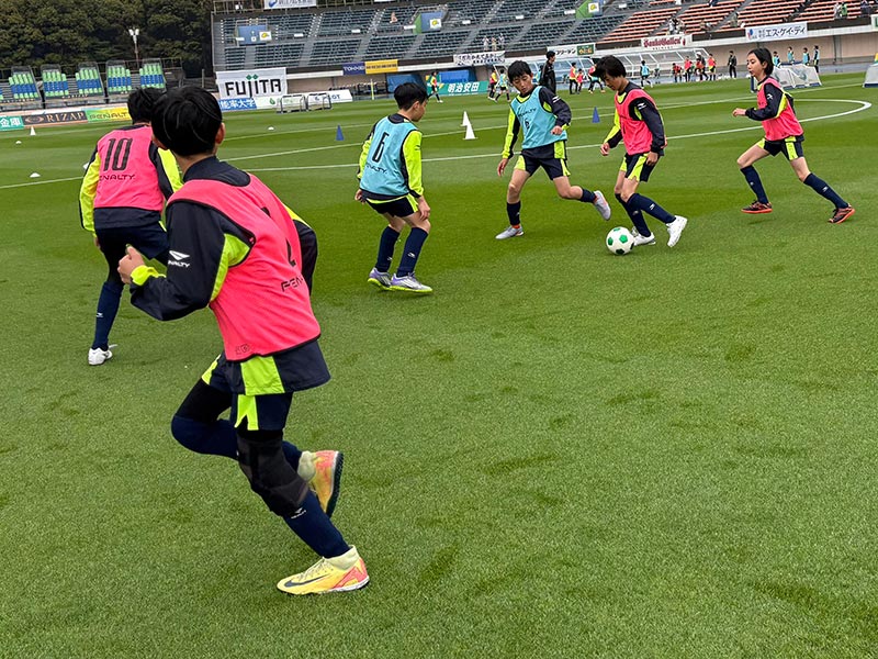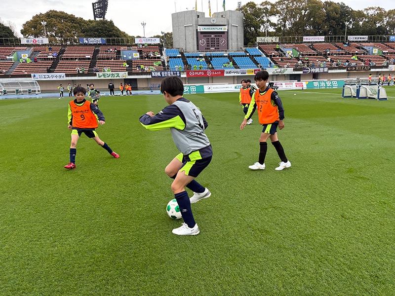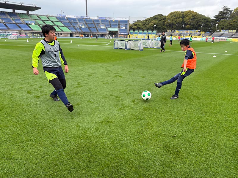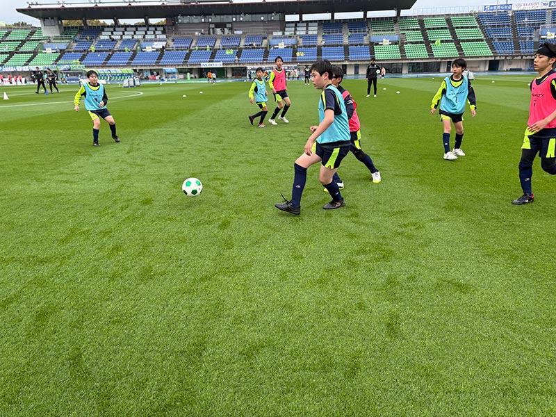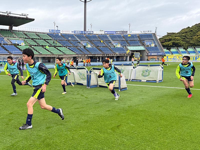 卒業式後には、トップチームのウォーミングアップをピッチ横で見学。プロ選手のプレーを間近で体感する貴重な機会となり、スクール生たちはそのスピードや迫力に目を輝かせていました。