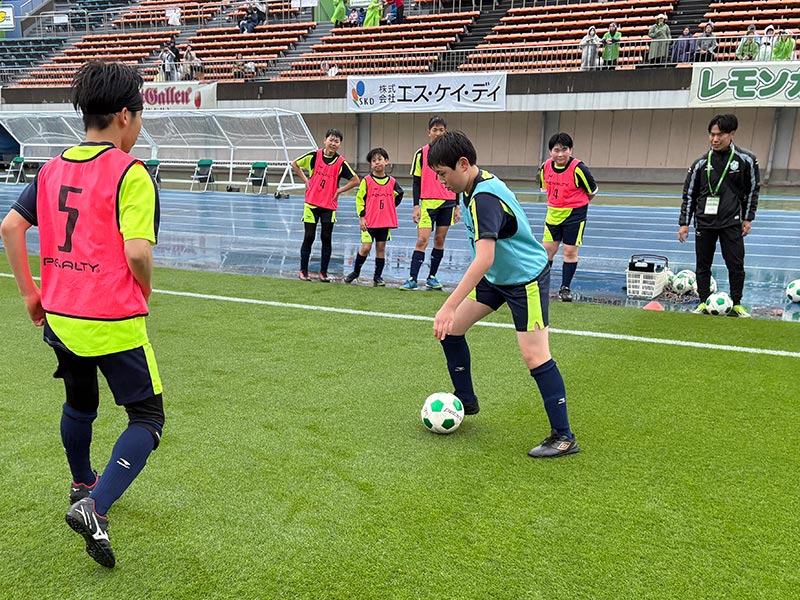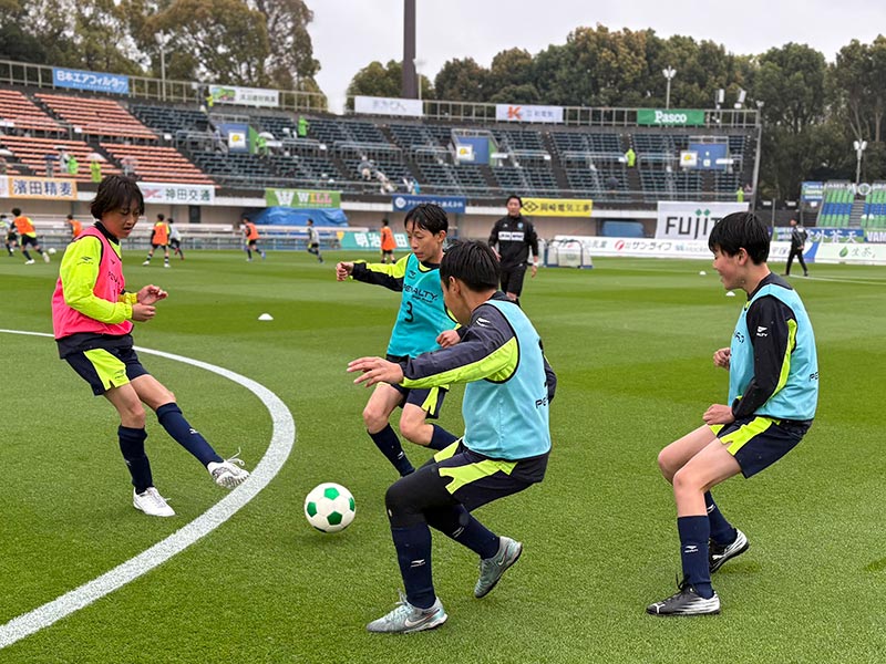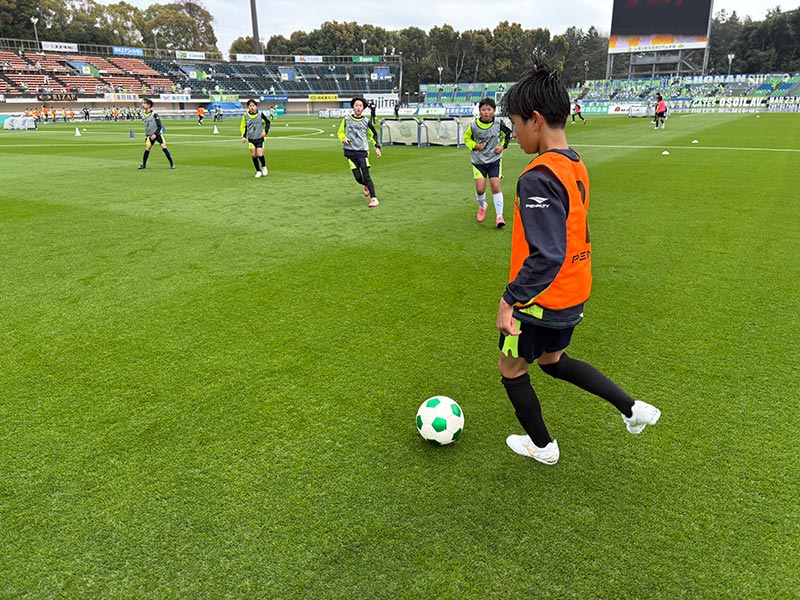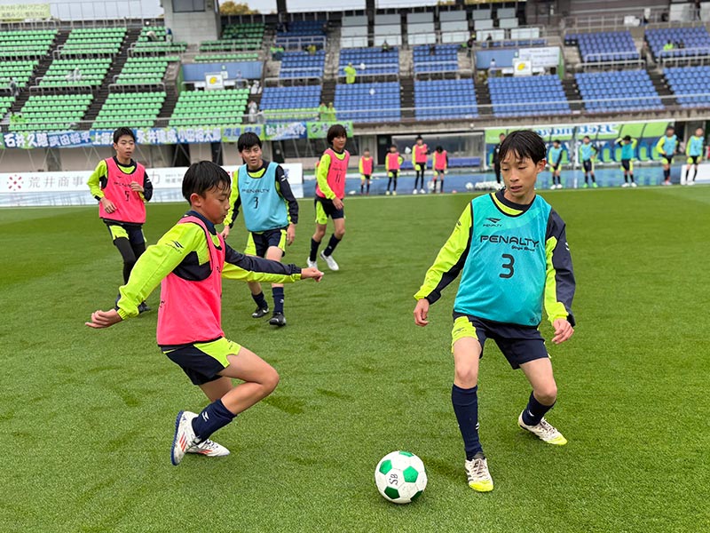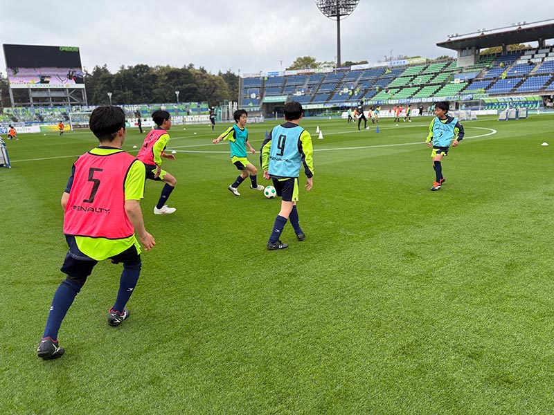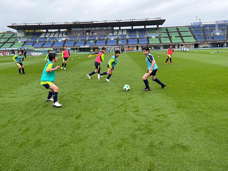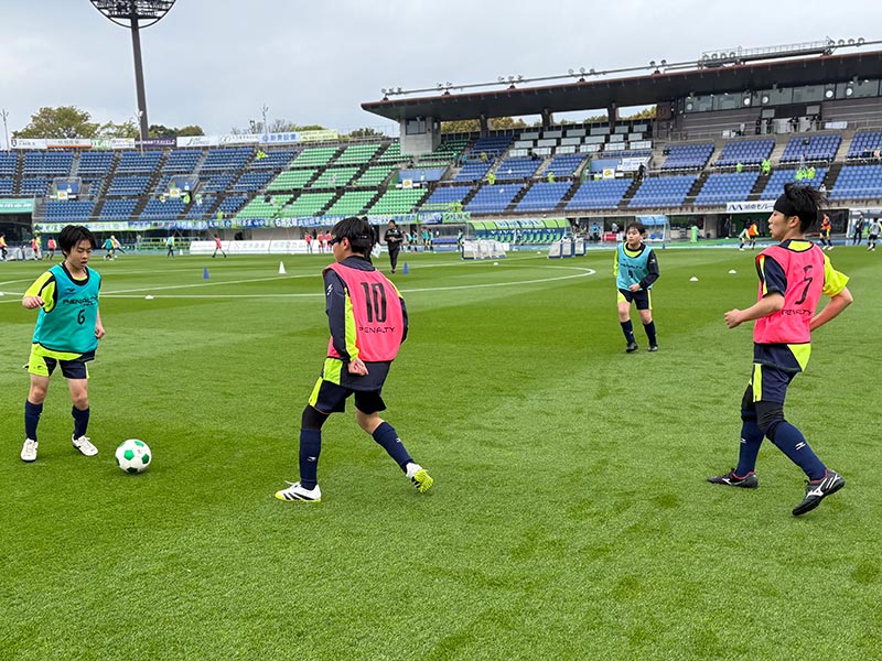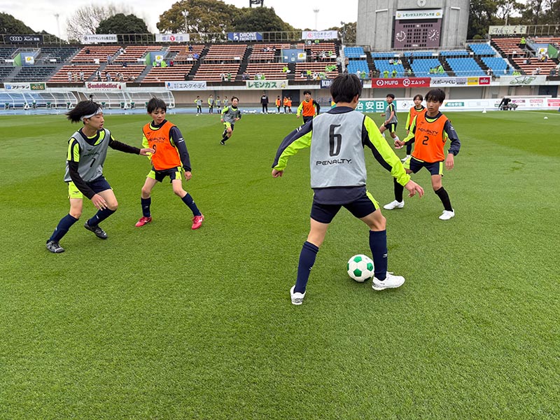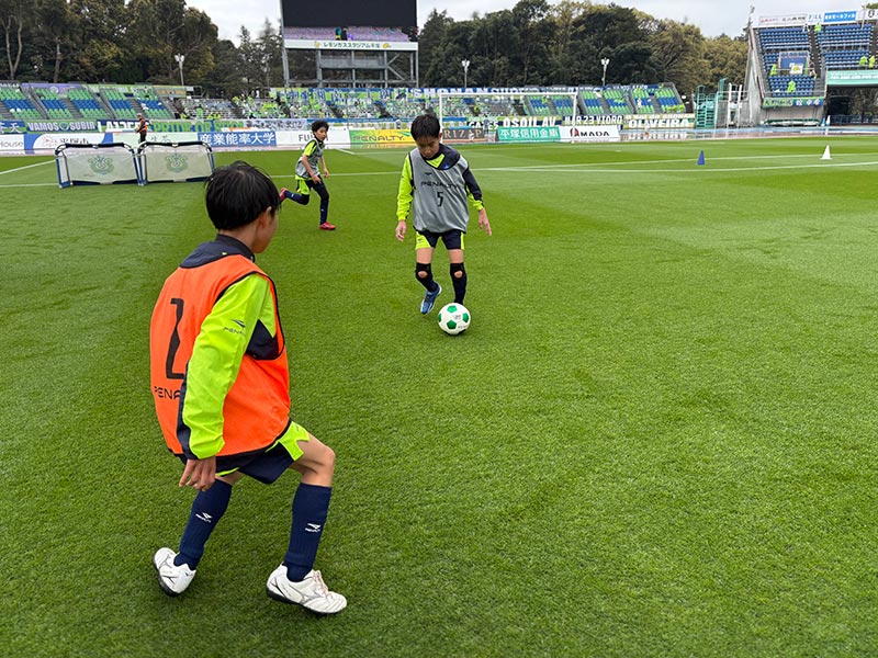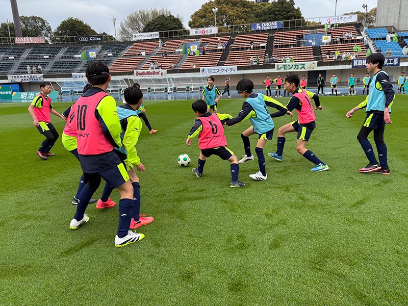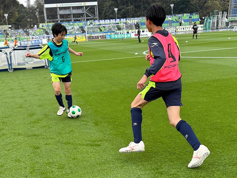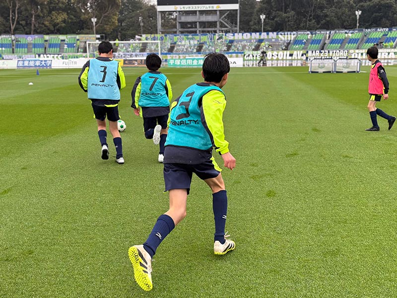 卒業式後には、トップチームのウォーミングアップをピッチ横で見学。プロ選手のプレーを間近で体感する貴重な機会となり、スクール生たちはそのスピードや迫力に目を輝かせていました。