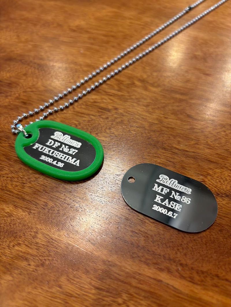 メインデザインのエンブレム、ロゴと選手キャッチフレーズ又は選手名、背番号が刻印されたチャームタグ。