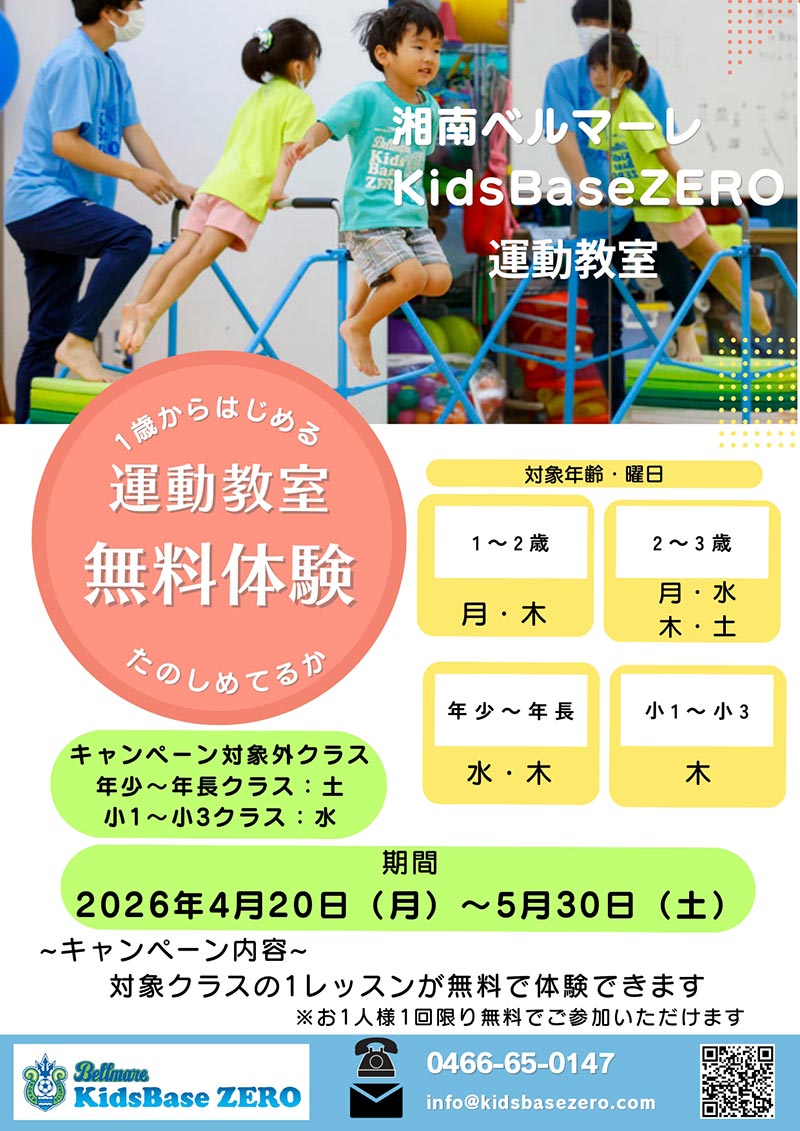 湘南ベルマーレKidsBaseZERO「運動教室」無料体験キャンペーンのお知らせ