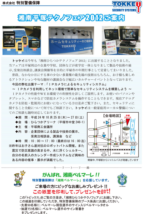 いよいよ今週開催!湘南ひらつかテクノフェア2012にオフィシャルクラブパートナー「特別警備保障ブース」出展!先着プレゼントも
