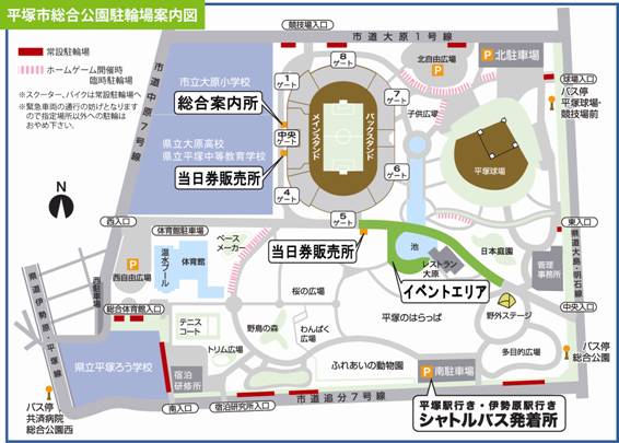 総合公園周辺には駐車場がございませんので、平塚駅周辺の駐車場をご利用ください。