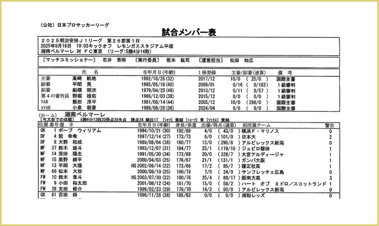両チームのスターティングメンバーや選手情報が記載された関係者用資料をスタジアムでお渡しいたします。