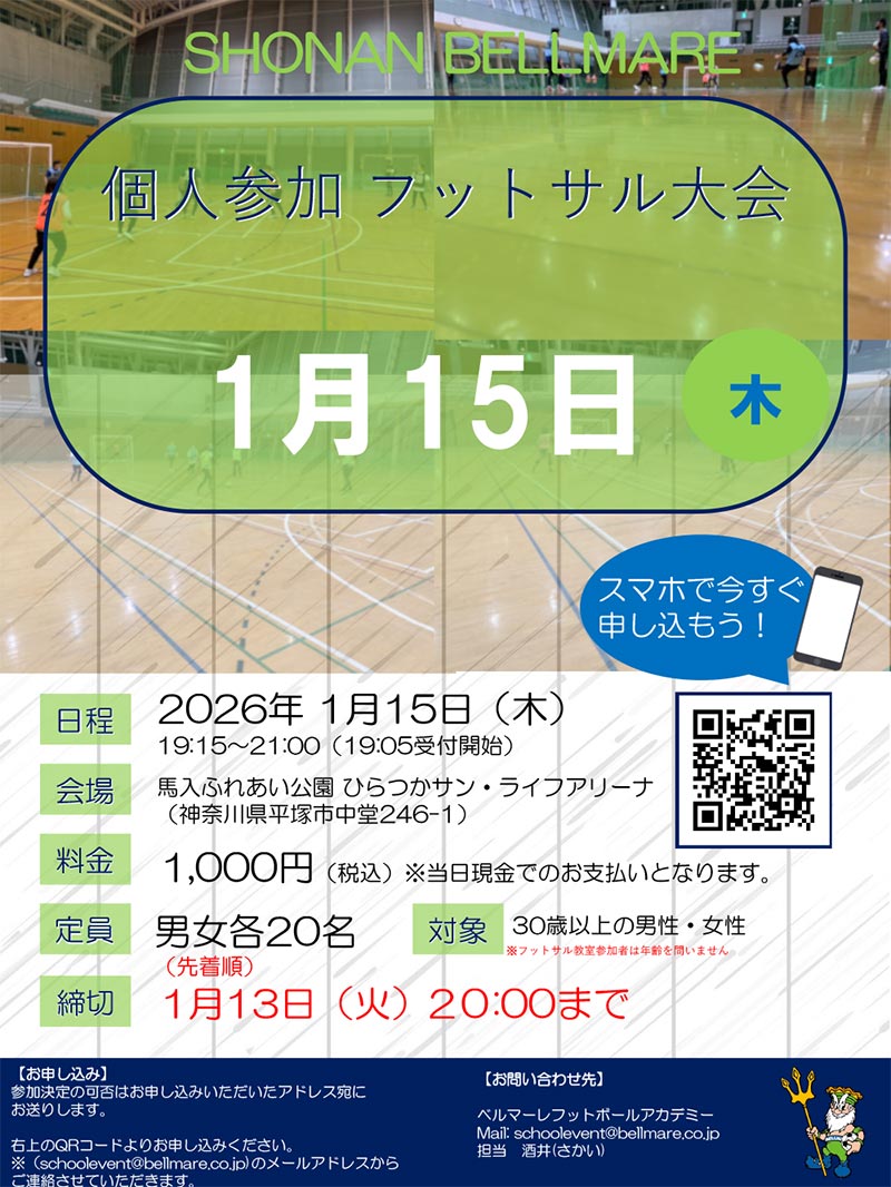 【参加者募集】1月15日(木)「個人参加フットサル大会」@ひらつかサン・ライフアリー ナ ≫