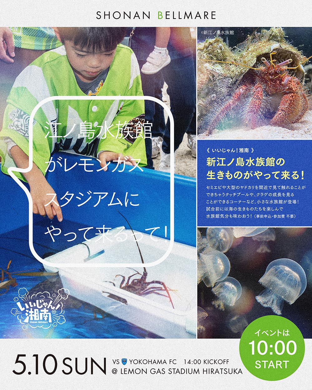 オフィシャルクラブパートナー 新江ノ島水族館の人気の生き物がやってくる! 今回はセミエビや大型のヤドカリを間近で見て触ることができるタッチプール、クラゲの成長を見ることができる水槽が登場します。 トリーターさんのお話もたくさん聞いてね!
