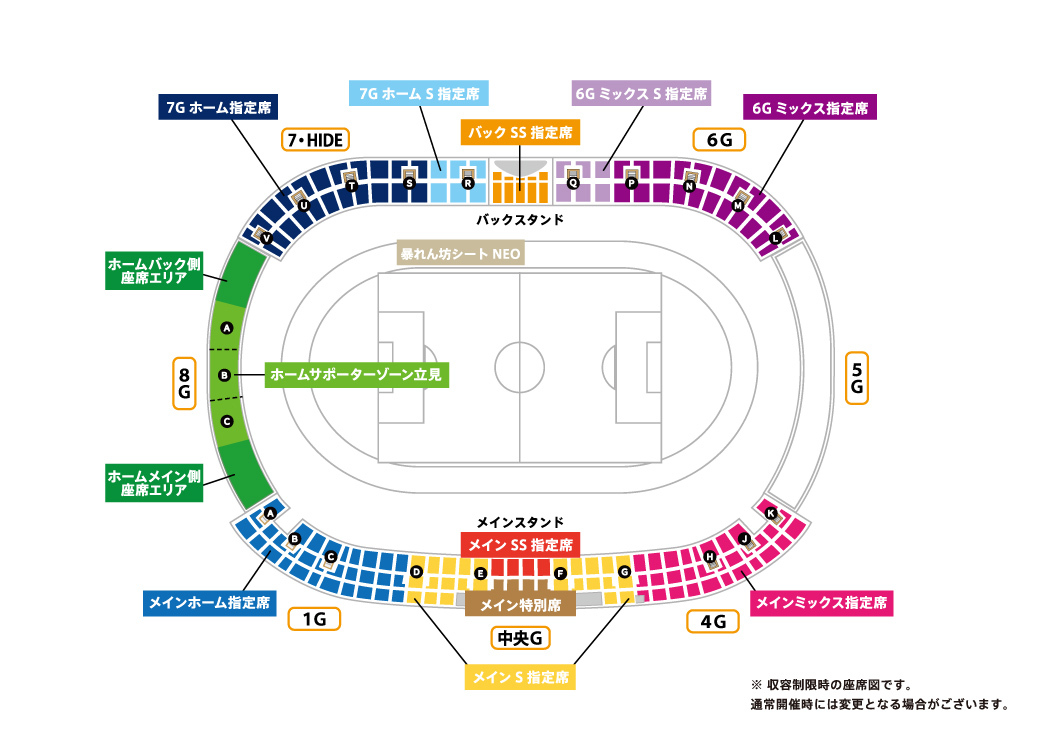 システムの都合上、座席選択をしてチケットを取得する際に、席種エリアがわかりづらくなっておりますので、以下の画像をぜひご参考くださいませ。