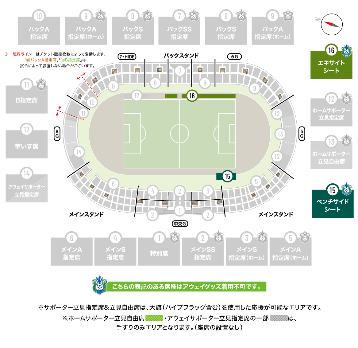 - ピッチ脇には広告看板などが設置されているため、一部ピッチが見切れる可能性がございます。また身長により見切れるエリアが異なりますので、お子様など身長の低い方がご観戦いただく際はご了承のうえ、お買い求めください。