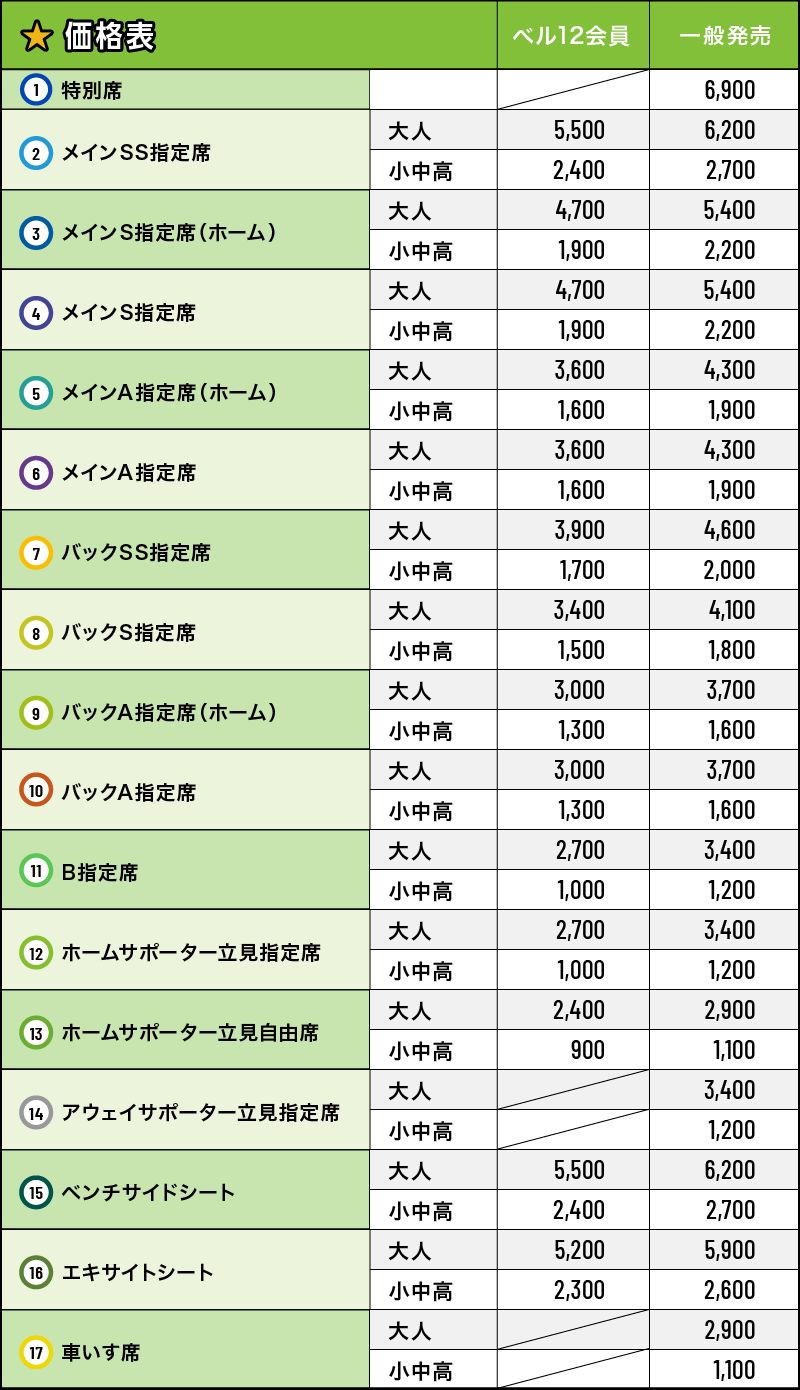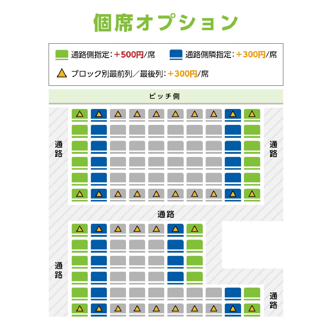 - ピッチサイドでの観戦となりますので安全の都合上、未就学児をお膝の上に乗せての観戦はご遠慮願います。必ず1人1席お買い求めいただけますようお願いいたします。