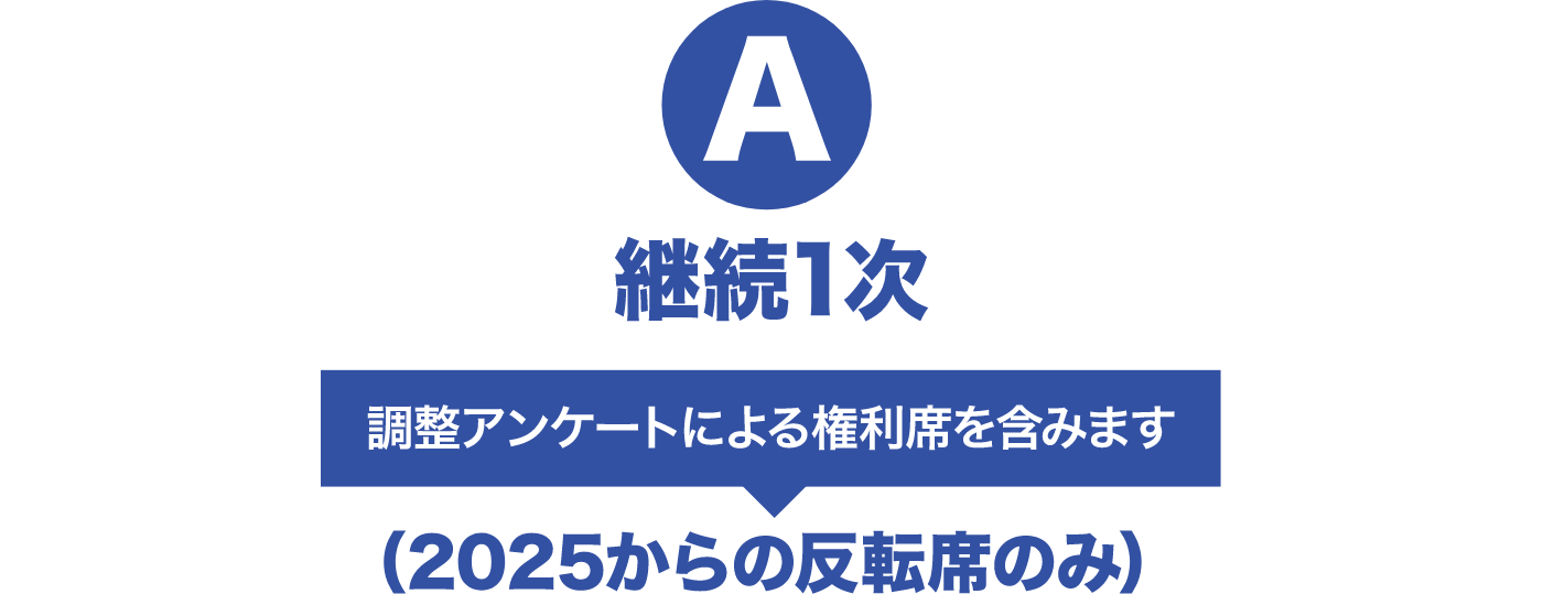 「A:継続1次」の期間内にお申込みがない「2025からの反転席」につきましては、「B:継続2次」以降の販売席として開放されます。 いかなる場合においても、座席権利の復活などはいたしかねますので、予めご了承ください。